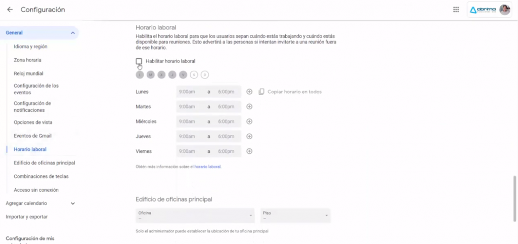 En este tutorial te ensenamos como activar el horario laboral en Google Calendar. Este opcion permite que si alguien te envia una invitacion a tu calendario fuera de tu horario de trabajo le muestre un aviso que no estas disponible.