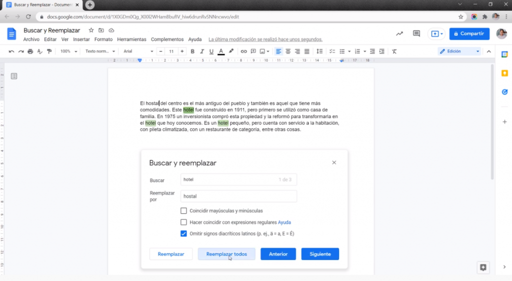 Google Docs ofrece una opción para buscar y reemplazar palabras de manera individual o masiva haciendo fácilmente el trabajo de corrección y edición de parrafos y/o textos.