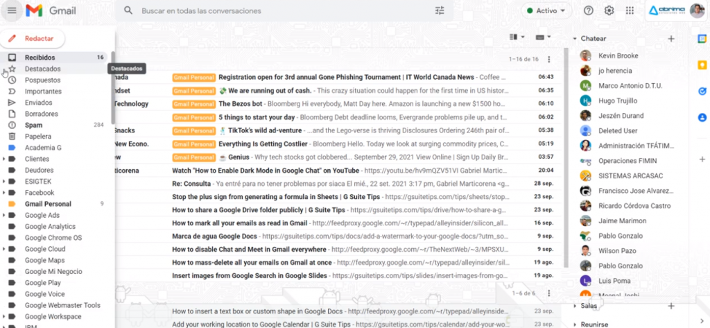 Las etiquetas (folders) de Gmail ocupan espacio en la interfaz. Hay una manera para minimizarlas y así tener mas espacio.